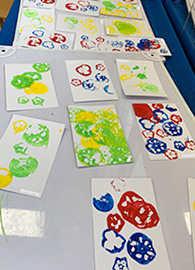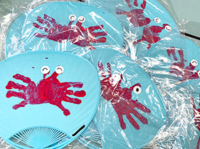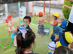 夏の特別保育で0・1・2歳児は、手形カニさん団扇、野菜スタンプを使って暑中見舞いのはがき、風鈴の絵付けなど色々な製作物を作ったり、毎日水遊びでシャボン玉や色水遊び、京都御所への虫探し散歩など、たくさん身体も動かして元気に過ごした夏休みでした!
