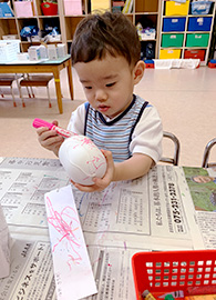 夏の特別保育…0・1・2歳児編 トピックス 2020-9-10 掲載 夏の特別保育で0・1・2歳児は、手形カニさん団扇、野菜スタンプを使って暑中見舞いのはがき、風鈴の絵付けなど色々な製作物を作ったり、毎日水遊びでシャボン玉や色水遊び、京都御所への虫探し散歩など、たくさん身体も動かして元気に過ごした夏休みでした! 2020 最近の トピックス 一覧へ ページ上部に戻る